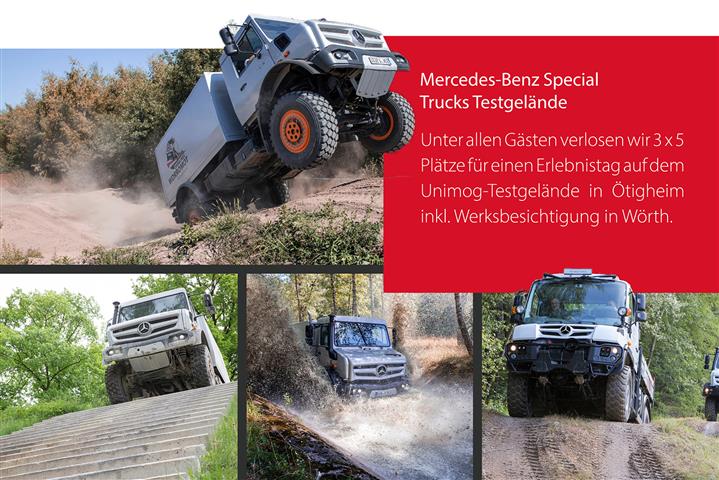 Als besonderes Highlight werden 3 x 5 Plätze für einen Erlebnistag auf dem Mercedes-Benz Special Trucks Testgelände in Ötigheim inkl. Werksbesichtigung der Unimog-Produktion in Wörth verlost.