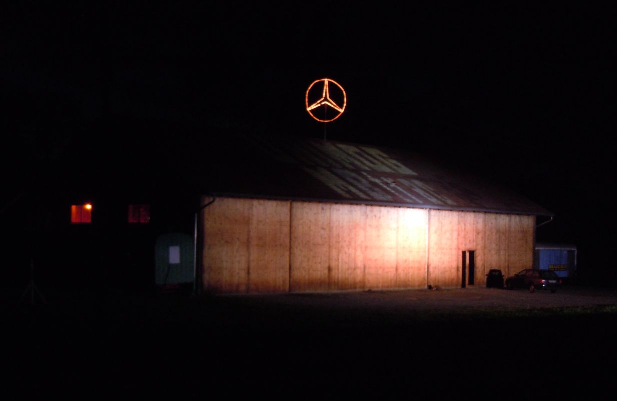 Gestern Abend wurde noch der drehbare und beleuchtete Mercedesstern mit 3 Meter Durchmesser auf der Festhalle installiert.